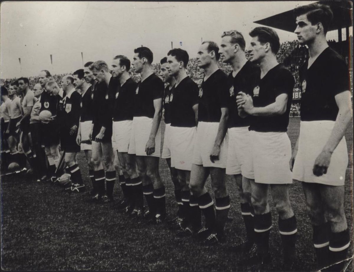 A magyar labdarúgó-válogatott tagjai az 1954-es világbajnokság egyik mérkőzésén (Lantos-hagyaték/ Puskás Intézet)