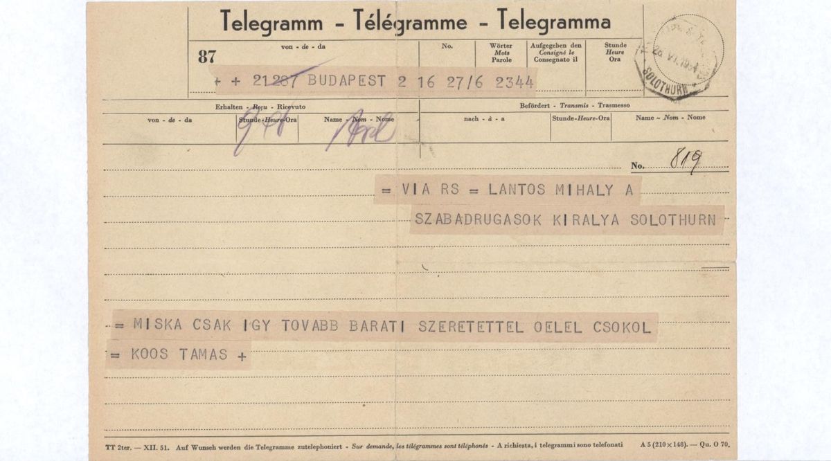 Lantos Mihály 1954-es világbajnokságra kapott távirata (Lantos-hagyaték/ Puskás Intézet)