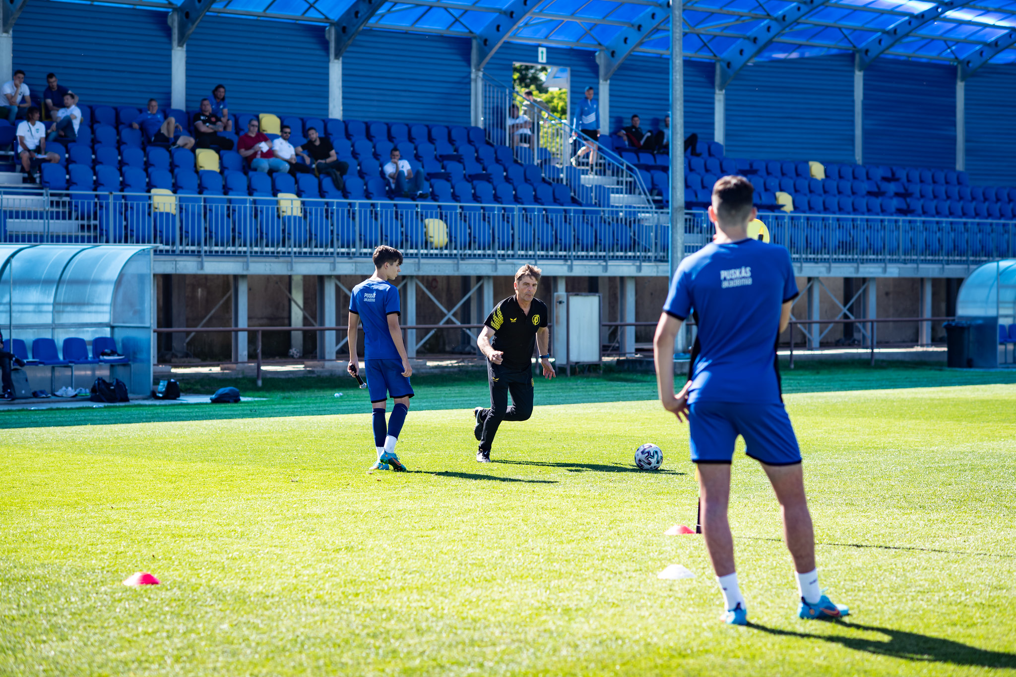 Az elméleti rész után a gyakorlati blokk következett, aminek első állomásán Horváth Attila jóvoltából a Padbol pályával, annak labdájával és szabályaival ismerkedhettek meg a résztvevők. A közös játék ezúttal elmaradt, így rögtön a Puskás pályára vonult át a nézősereg, hogy megtekintse Kanta Szabolcs, Fóris Róbert, Magasföldi József és Fodor Marcell poszt specifikus edzésbe rejtett egyéni képzését Horváth Péter közvetítésével. A gyakorlatok bemutatásában U17-es együttesünk játékosai először két csoportban, majd pedig éles játékhelyzetbe illesztve közösen segítették edzőinket.