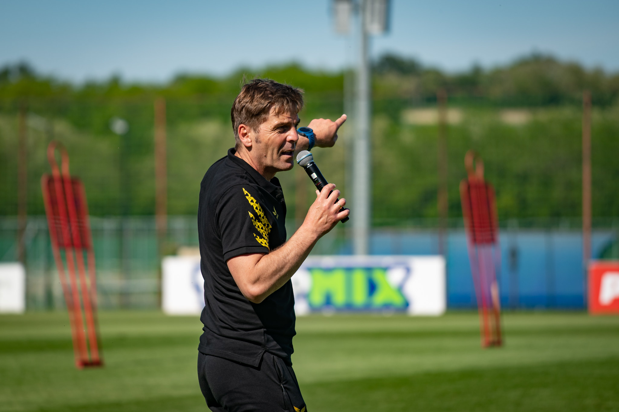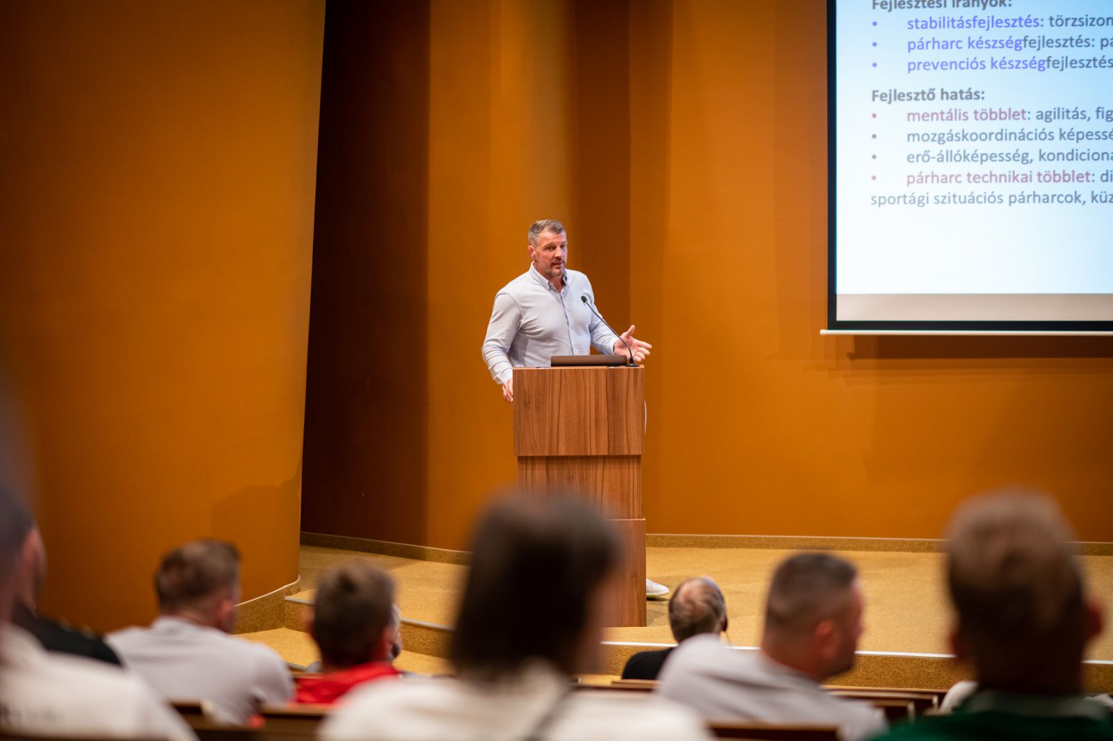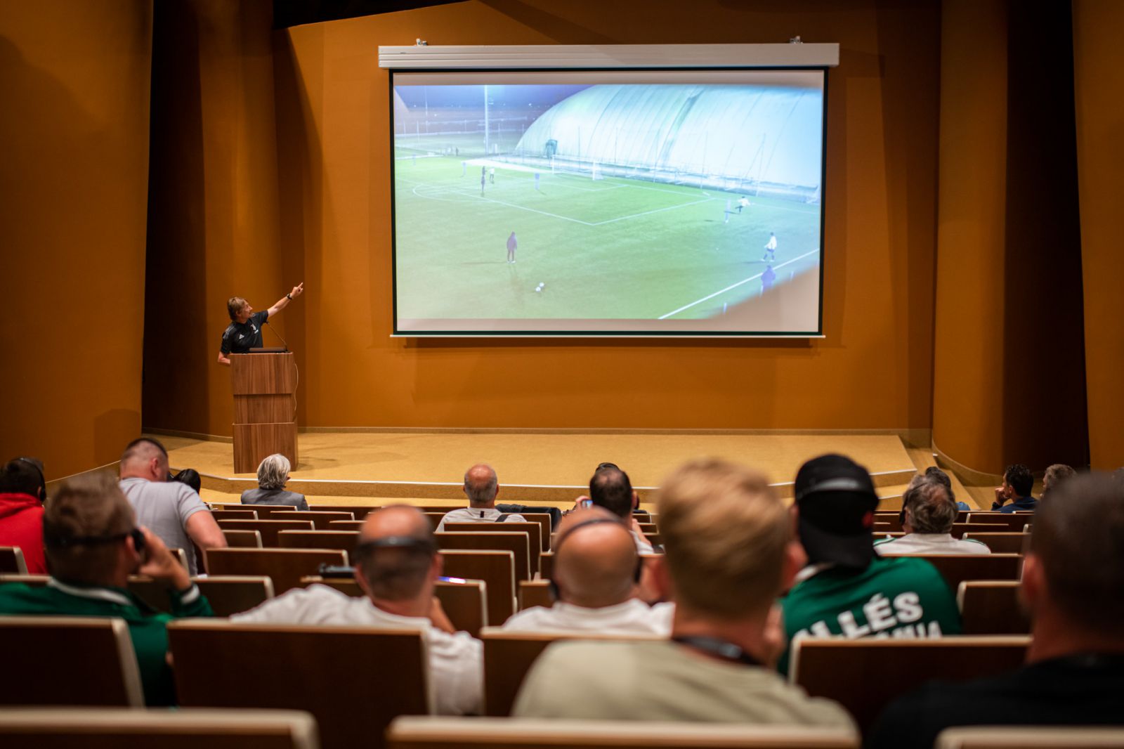 A nap első előadójaként Horváth Péter, Puskás Akadémia szakmai igazgatója mutatta be a Felcsúton folyó munkát. A prezentáció olyan alapelvek bemutatásával kezdődött, mint például a védelmi vonal meghatározása, a középpályások kommunikációs képességének fejlesztése vagy éppen a támadó játékosok labdaszerzésre irányuló mozgása. Akadémiánk rendszerének bemutatásából az is kiderült, hogy a szakemberek közötti megfelelő kommunikáció milyen mértékben segíti az egyéni képzés folyamatát. Ennek hiányában nem csak az edzők, hanem a játékosok sem kaphatják meg a megfelelő visszajelzéseket.