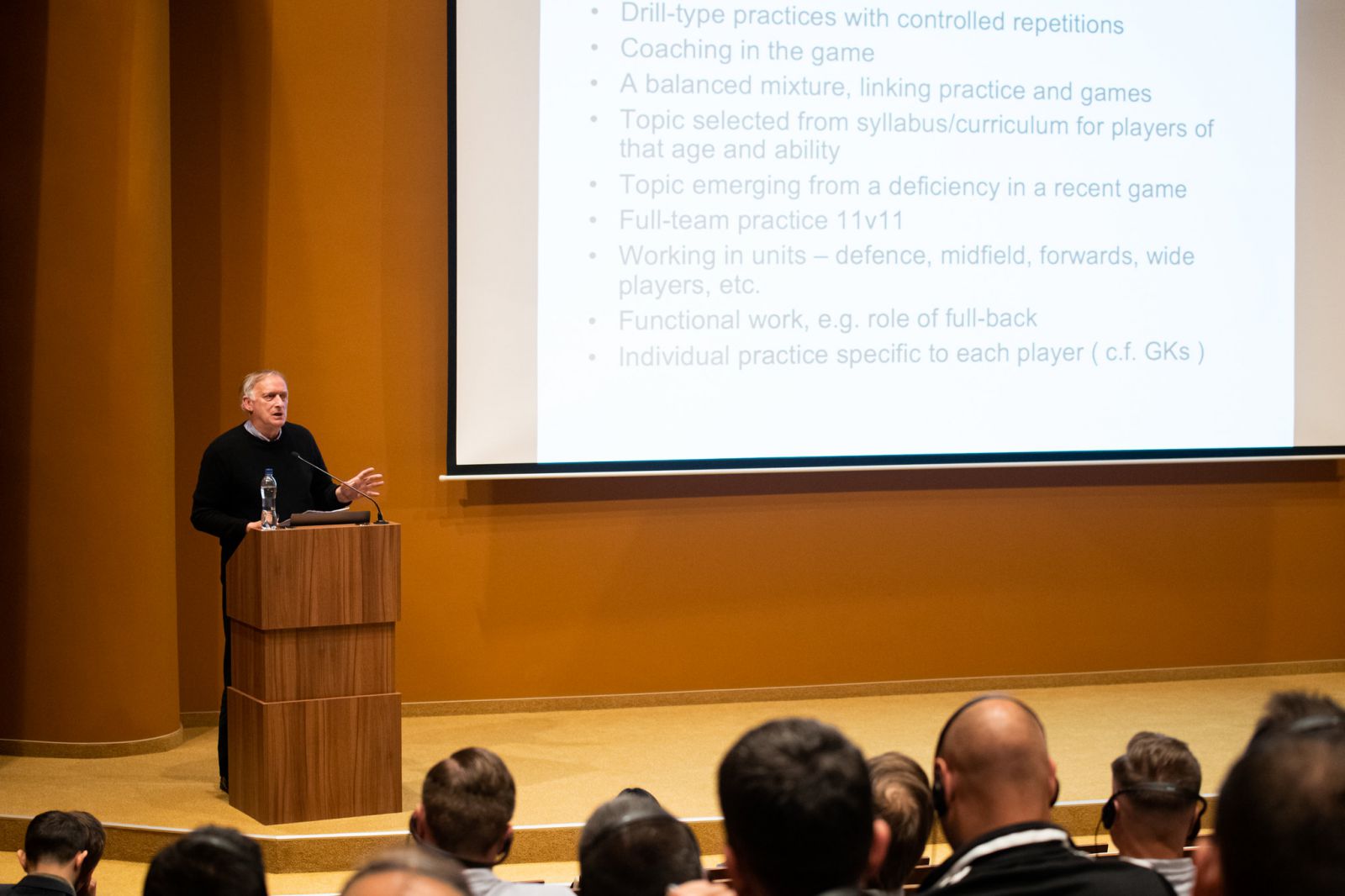 A négy évtizede utánpótlás fejlesztésben dolgozó szakember szerint a döntéshozatal fejlesztéséhez a kiscsoportokban végzett feladatok a leghatékonyabbak. Ezen belül a három-három elleni játékok számos variációját ajánlotta a közönség tagjainak. Ezek után az edzésen elsajátított feladatokkal magtanult döntéshozatali folyamatok alkalmazásának komplexitását mutatta be egy folyamatábra segítségével. Egy elképzelt labdavesztéssel érzékeltette, hogy egy játékosnak mennyi döntést kell meghoznia egy pillanat törtrésze alatt.