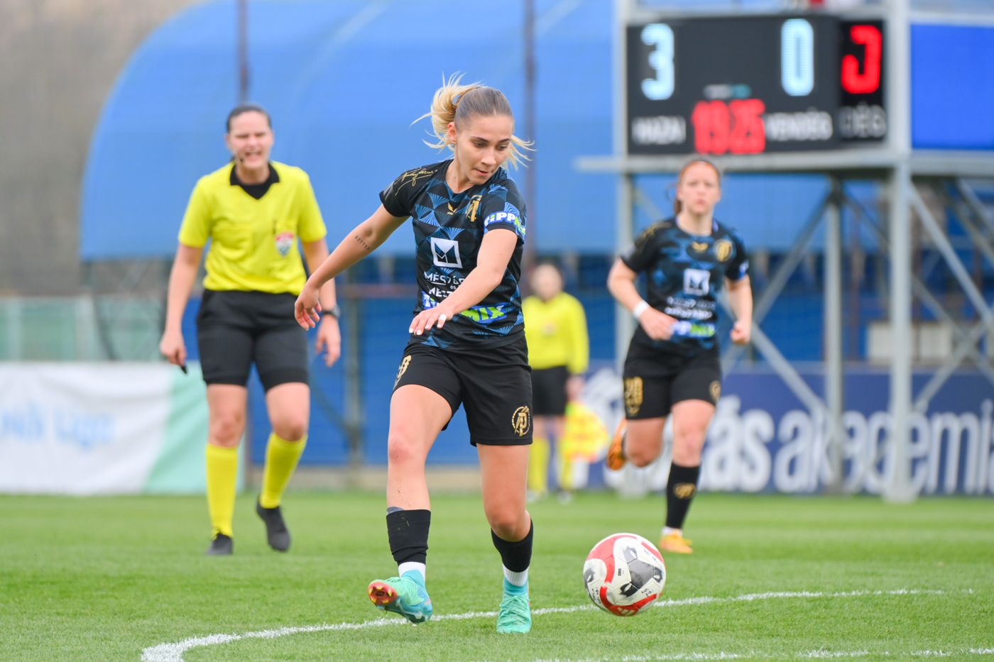 A sípszó után azonnal magunkhoz ragadtuk a kezdeményezést, az 5. percben egy jobb oldali beadásból Melana Szurovceva veszélyeztetett, de a vendégek kapusa szépen védett. Tíz percig a mezőnyfölényünket leszámítva semmi érdemleges nem történt, majd hirtelen összesűrűsödtek az események. Egy jobb oldali bejátszást követően Szurovceva tökéletesen tálalt a gólvonalnál ólálkodó Tamók Rebekához, ő pedig közelről, egy fehérvári játékost is érintve a hálóba juttatta a labdát. (1–0)