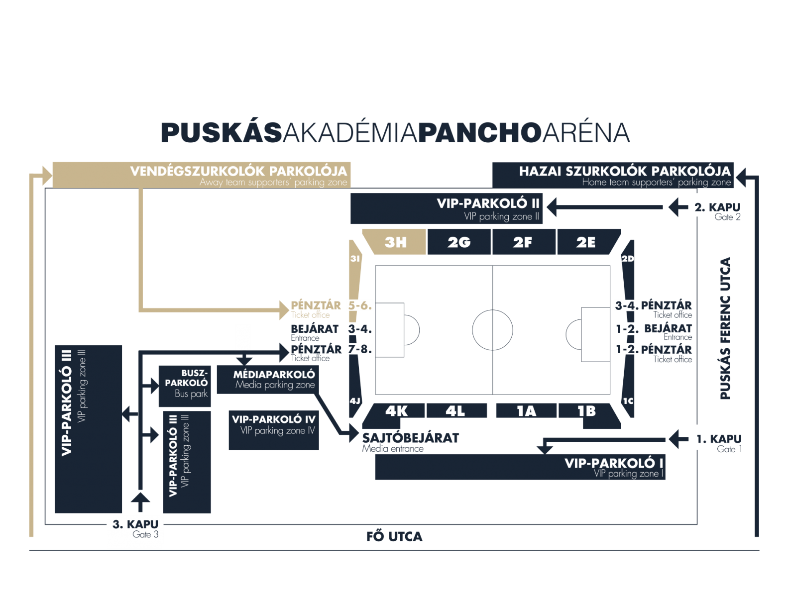 A hazai szurkolókat a Puskás Ferenc utcánál engedjük be a 2-es bejáratnál (2G, 2F, 2E, 2D). A 3-as bejárat a vendégszurkolóké (Entrance 3 is for away fans).